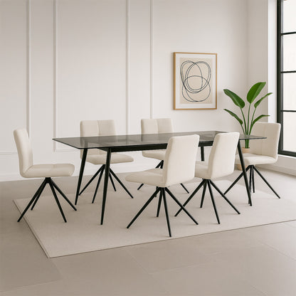 The Emma 7-piece dining set combines contemporary elegance with optimal functionality. It includes a modern table with a tempered glass top and six comfortable chairs, designed to enhance your dining space while withstanding everyday use.