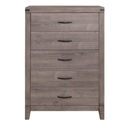 Product Description: An industrial design is subtly used to achieve a sleek look for your bedroom in the Woodrow collection. Dark metal hardware and corner strips with a rivet look contribute to the casual aesthetic of this chest of drawers. The melamine veneer features a distressed wood look that reinforces the intended design. A matching bed, dresser, mirror and nightstand are available.