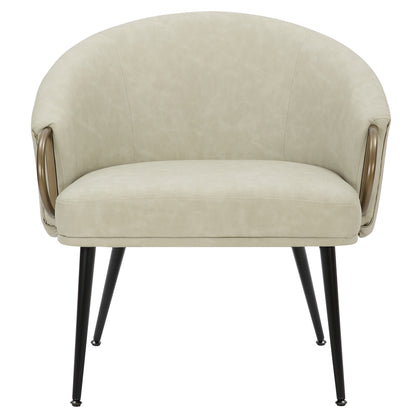 Add a touch of mid-century modern sophistication to your space with the Zita accent chair in vintage ivory faux leather. Its sleek design and distressed gold accents make it a statement piece.