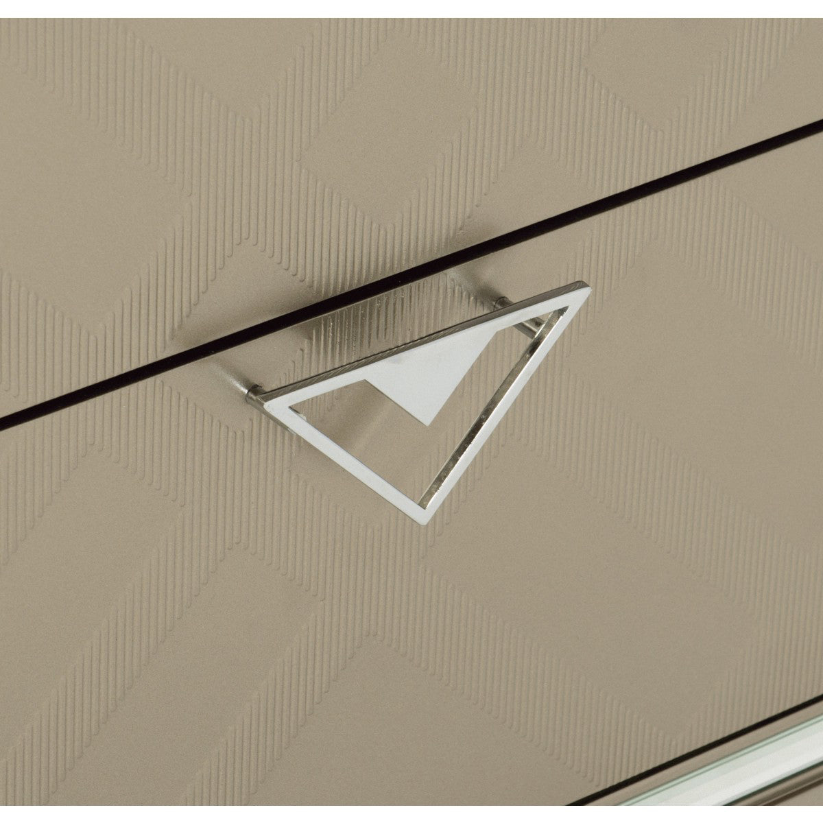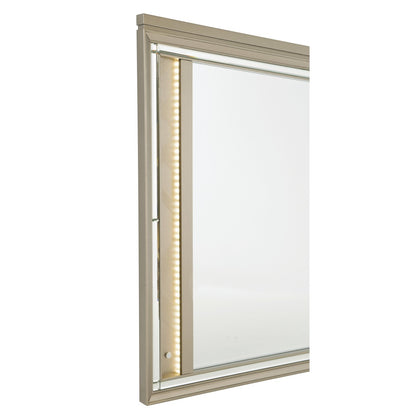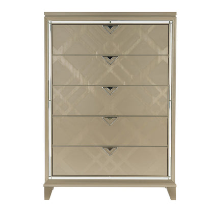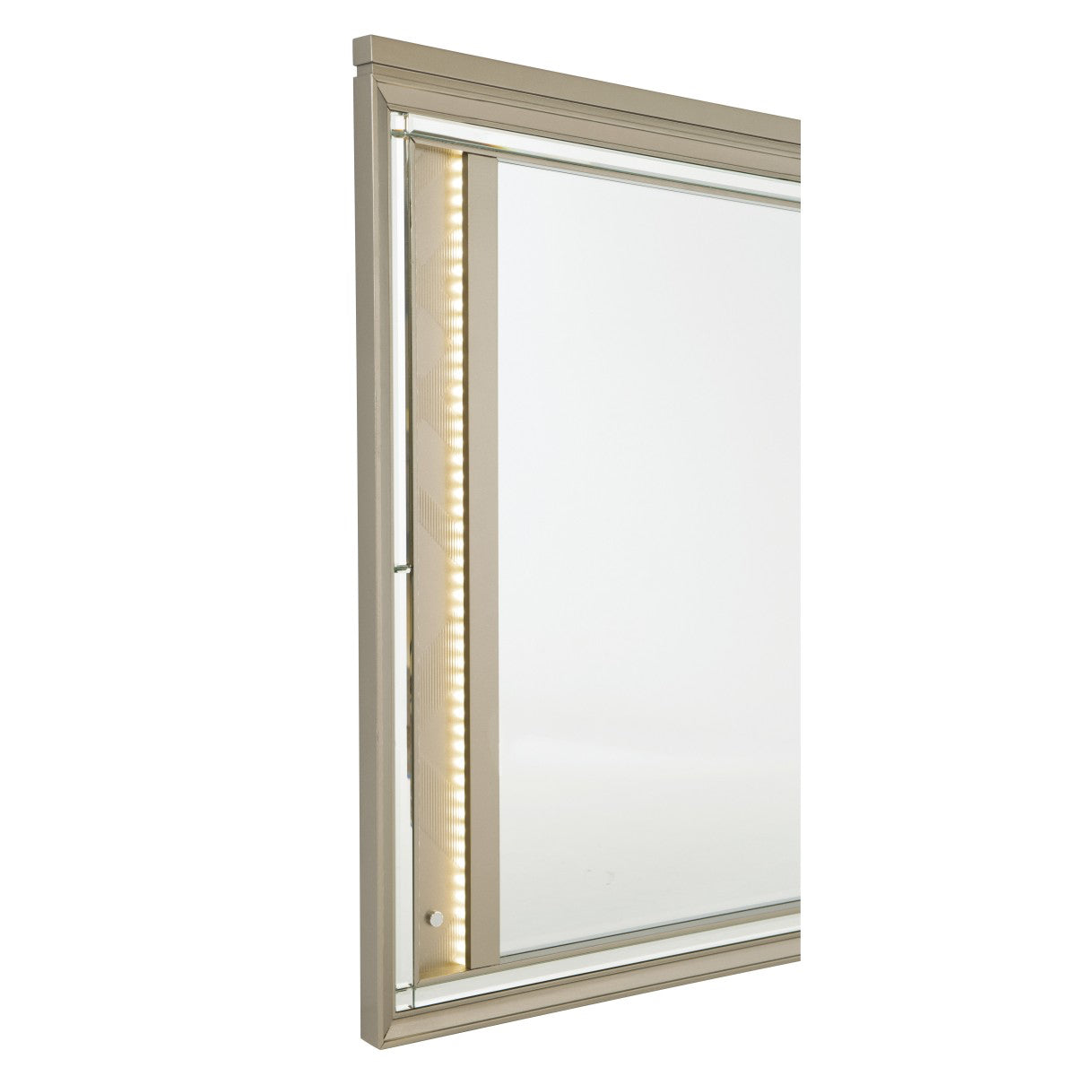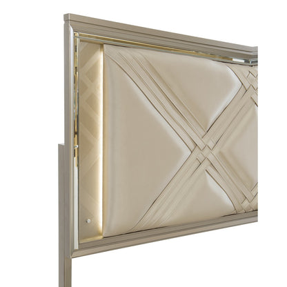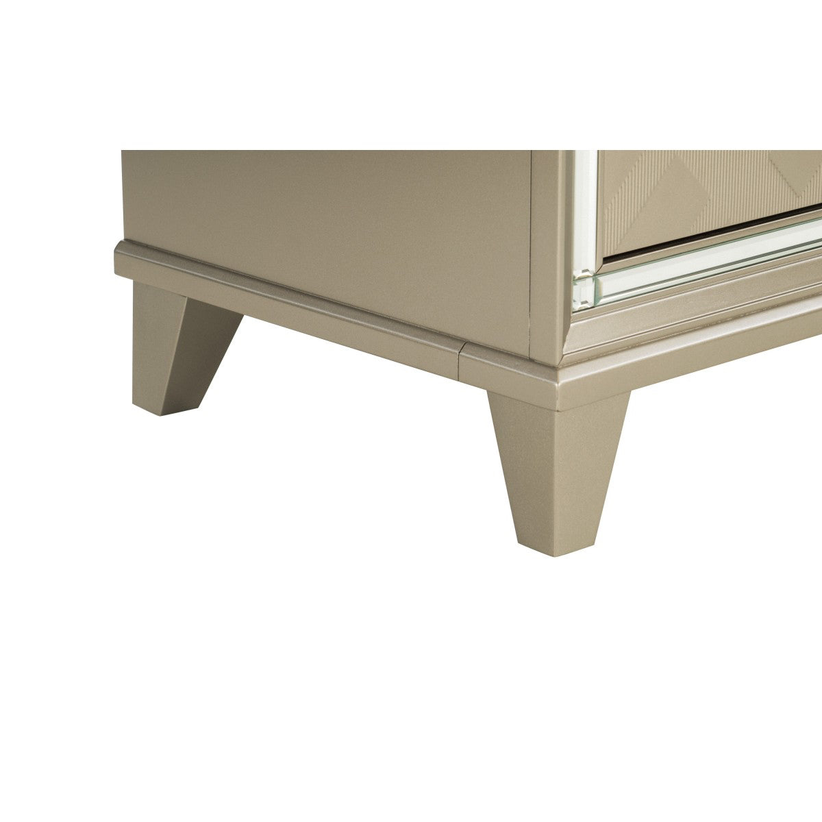 Dramatic from every angle, the Bijou collection makes a glamorous statement to your boudoir decor. The bed's unique profile features a V-notch design that not only serves as a focal point, but also provides inspiration for the woven pattern that faces each piece in the collection. The backlit faux leather headboard insert is featured in a champagne tone that perfectly complements the collection's champagne finish. The mirrored framing of each piece provides a subtle reflection and distinct accent. The storage footboard, dresser, mirror, dresser and vanity drawers feature polished chrome hardware in a triangle shape. The available dresser and vanity feature concealed jewelry drawers for discreet storage of your personal accessories. The vanity also has jewelry hooks mounted to the back of the mirror as well as drawers, a center glass top and a coordinating stool.
