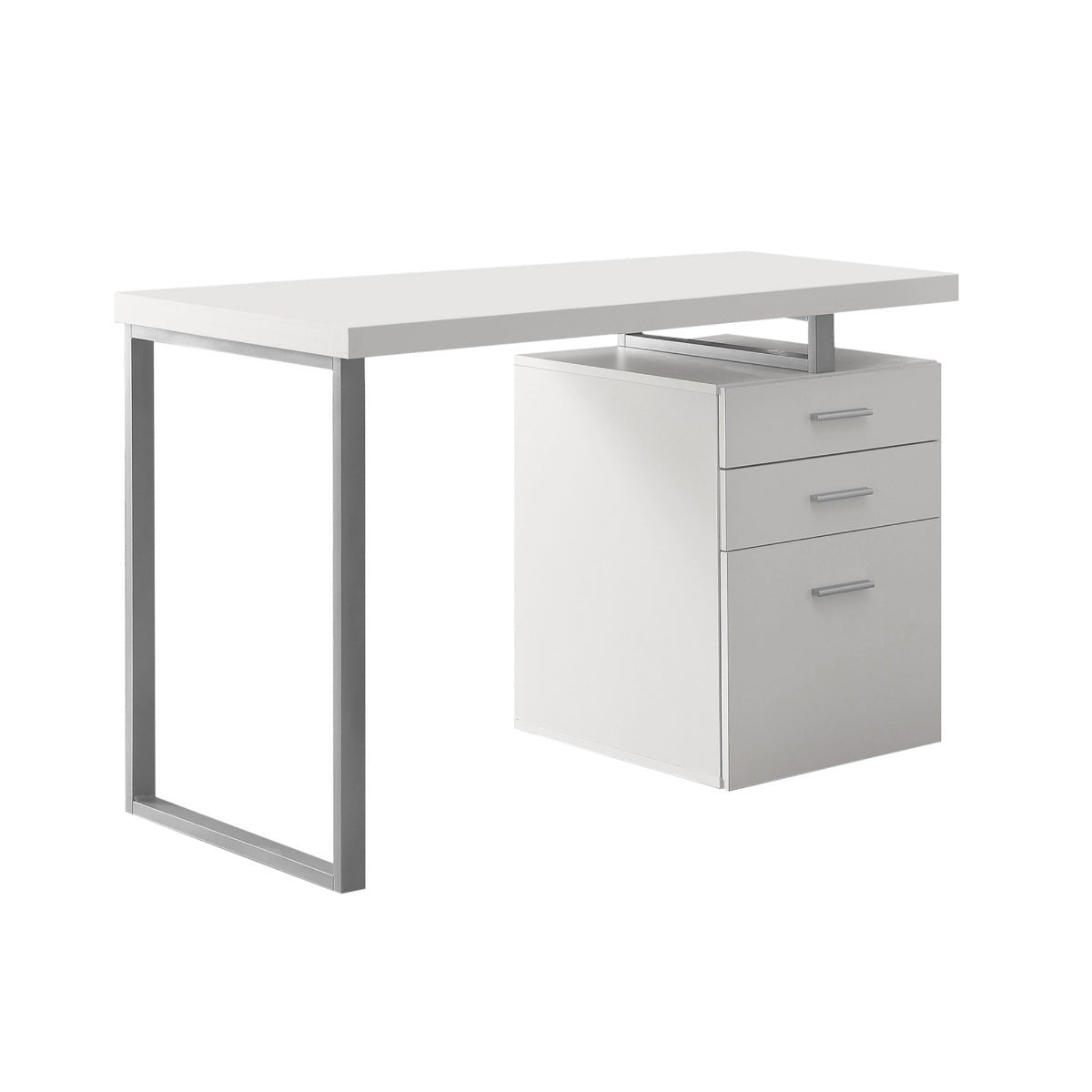 Simple and contemporary, this white finished desk is a perfect combination of durability and modernity. With its clean lines, floating top workspace and silver metal base, this piece will add a touch of style to your home. With two large storage drawers and a filing cabinet that can be assembled on the left or right side, this desk can be adapted to your needs easily.