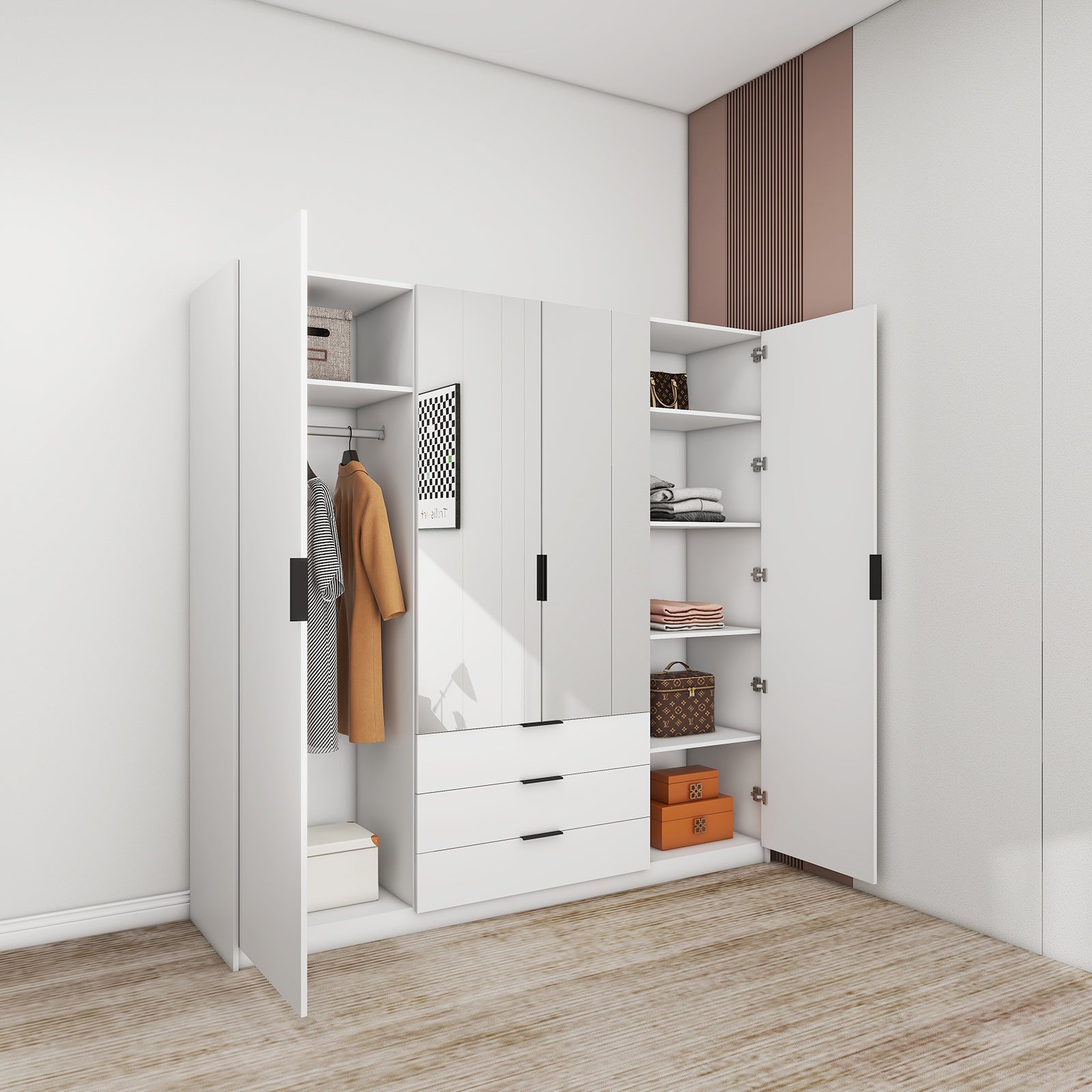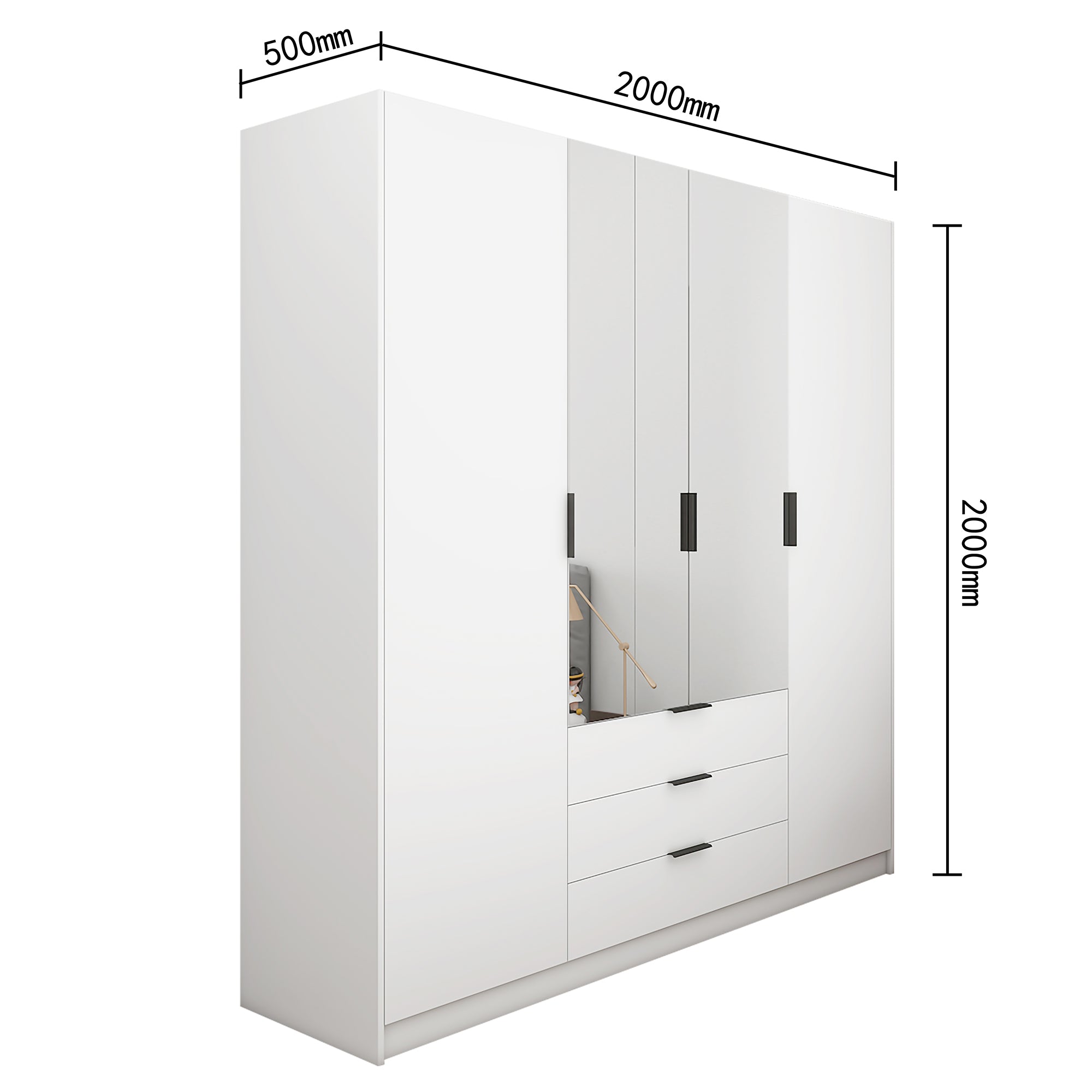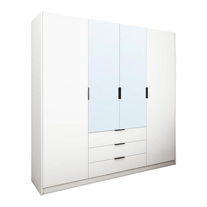 Notre Armoire Blanche à Porte Lustrée avec 4 portes combine style et fonctionnalité pour répondre à vos besoins de rangement. Les portes blanches lustrées ajoutent une touche élégante à votre espace, tandis que les deux grands miroirs au milieu offrent une praticité supplémentaire. Les poignées en noir complètent l'esthétique moderne de cette armoire.