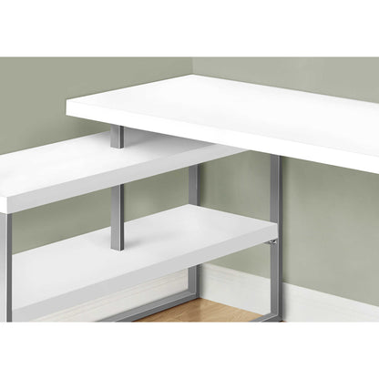 - Bureau d'ordinateur en forme de L avec rangement. Comporte des panneaux épais au fini blanc avec base en métal argenté