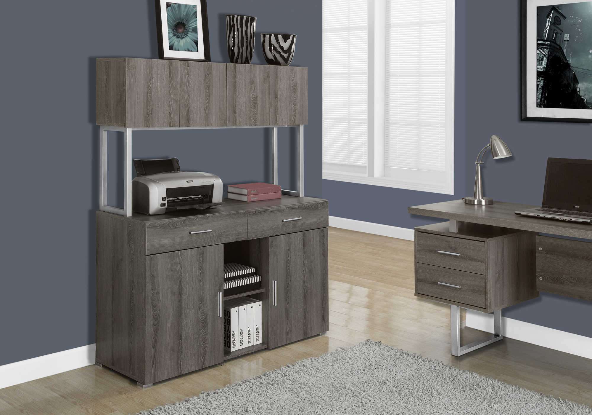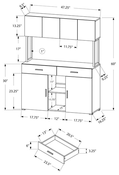 Élégante et fonctionnelle, cette crédence ajoutera une touche moderne à votre bureau à domicile. Cette armoire de bureau durable présente une grande surface de travail avec des accents argentés qui donnent une sensation ultra contemporaine. Il offre deux tiroirs profonds, deux cabinets avec tablettes ajustables et de l'espace de rangement additionnel au-dessus. Cette crédence saura organiser et styliser votre espace.