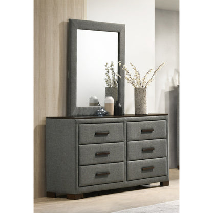 L'ensemble de chambre à coucher Dylan en tissu gris et accents bois offre une esthétique moderne et apaisante à votre espace de repos. La combinaison de nuances de gris doux et de détails en bois crée une atmosphère chaleureuse et contemporaine, parfaite pour une escapade tranquille.