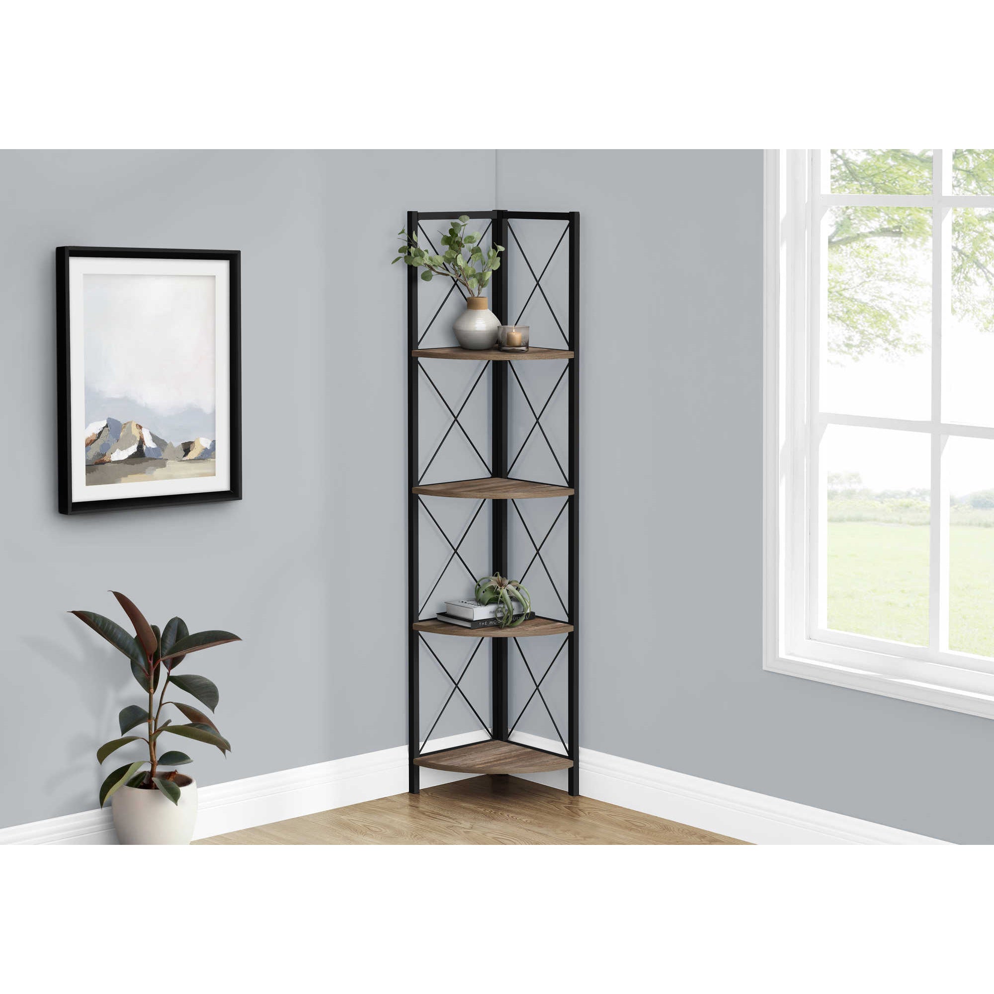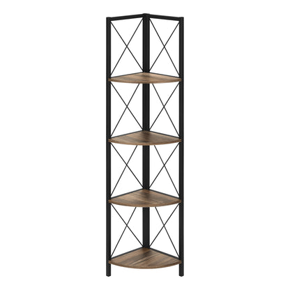 Parfaite pour des cadres photo, plantes, objets décoratifs et même des accessoires de cuisine, cette bibliothèque en coin améliorera votre décor. Elle comprend 4 étagères finies faux bois récupéré brun et un cadre en métal noir à trois pattes. Le cadre est garni d'un design en X pour ajouter une touche moderne à votre pièce. Cette étagère impressionnera vos convives. L'assemblage est requis.