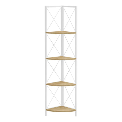 Parfaite pour des cadres photo, plantes, objets décoratifs et même des accessoires de cuisine, cette bibliothèque en coin améliorera votre décor. Elle comprend 4 étagères finies faux bois naturel et un cadre en métal blanc à trois pattes. Le cadre est garni d'un design en X pour ajouter une touche moderne à votre pièce. Cette étagère impressionnera vos convives. L'assemblage est requis.