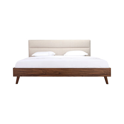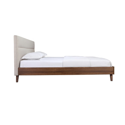 Le lit King Fletcher combine avec élégance bois et tissu, tout en jouant sur des contrastes de teintes claires et foncées. Sa tête de lit rembourrée en tissu beige clair apporte une touche de fraîcheur qui s'oppose harmonieusement à la finition plus sombre en faux noyer du pied de lit. Le tissu en lin subtilement texturé de la tête de lit met en valeur le grain distinct du cadre en bois.