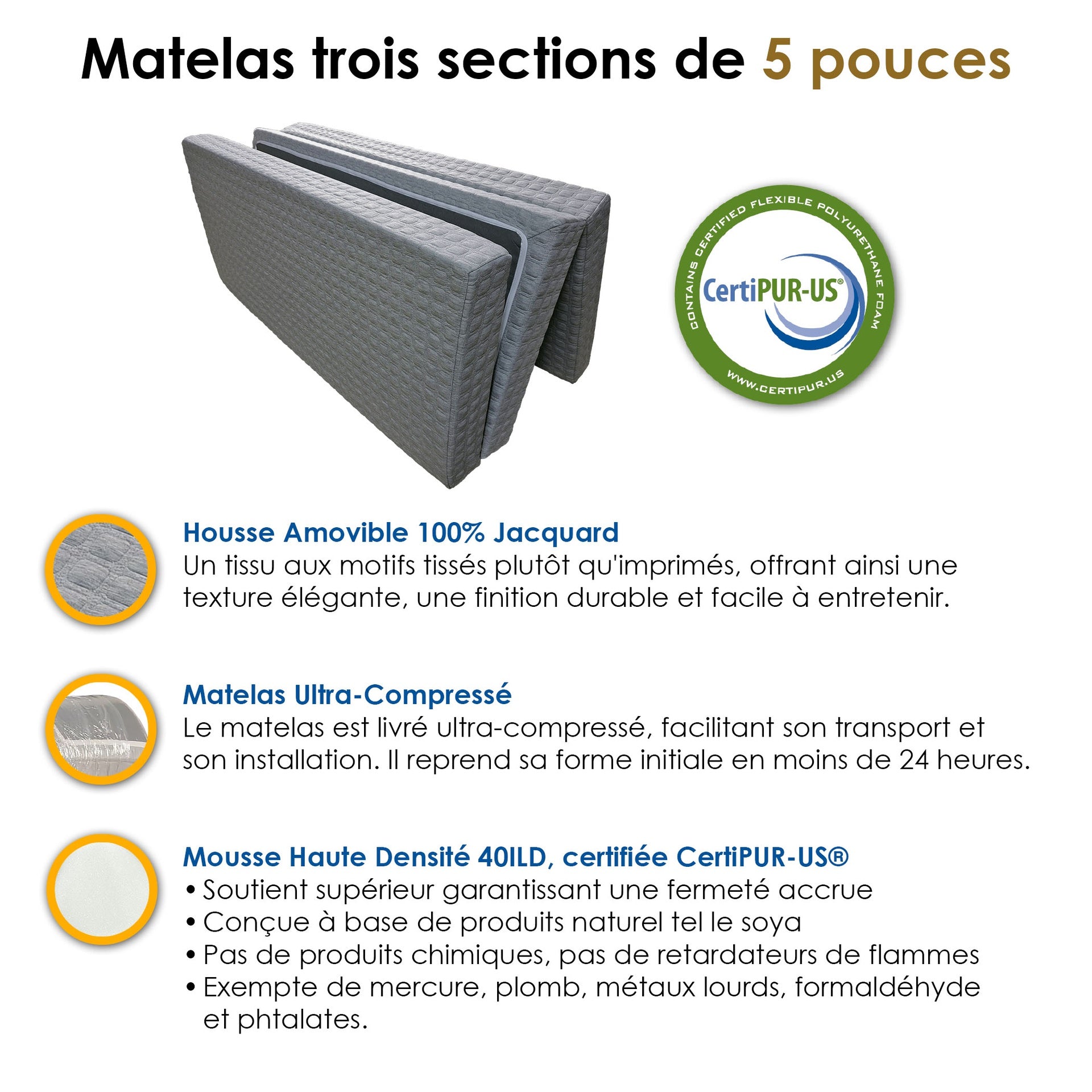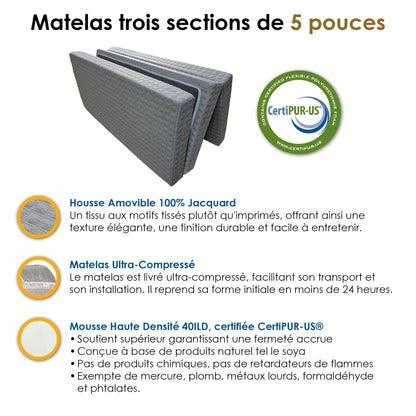 - Épaisseur 5 pouces, mousse haute densité 40 ILD pour un soutien optimal.